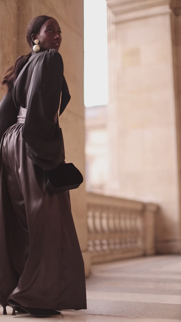 The trousers feature an extreme high-waist & an attached, long, wide wrap that can be tied & styled in a variety of ways. -